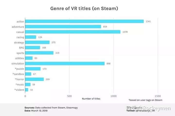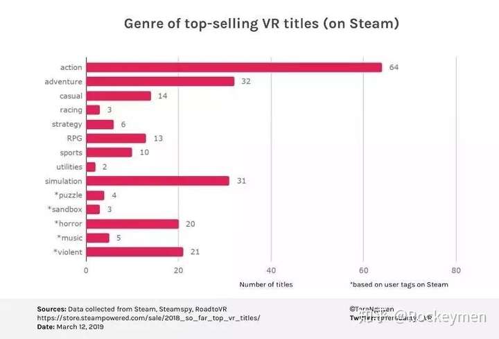 第一张是 Steam 上,VR 游戏类型分布,可见,排在前列分别是:动作、休闲、模拟 和 冒险类。