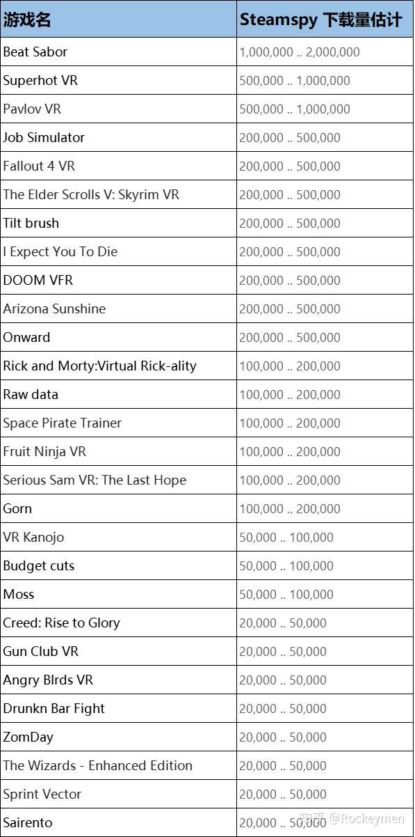 目前玩 6dof 游戏的主要设备有:PCVR、PSVR、Quest 这几家。其中,PCVR 全球大约总量在 500w 台左右,PSVR也是类似量级,Quest 因为2019年刚上市,所以目前销量还很小,我们假设它到年底能有100w+的销量,所以,这三者加起来,目前玩 6dof 游戏的VR设备,总量在 1000w 台左右,日活在 100w 左右,这就是 2019 年VR设备的总盘子大小。