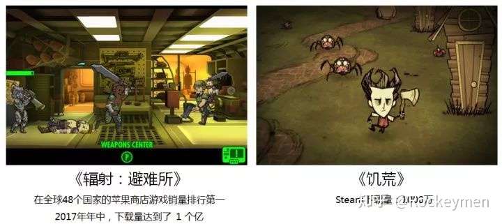 我们先看两个平面设备上比较热门的游戏:一个是 Bethesda 的 《辐射:避难所》。这个游戏是简单的2D画面,但其细致入微的动画细节,仍然让人拍手称赞。这个游戏的成绩是大家有目共睹的,曾经在48个国家AppStore销量排行第一,2017年,下载量达到了 1 个亿。